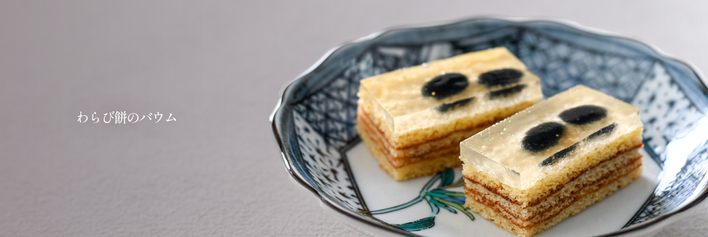 季節の移ろいを感じていただくことが萬久の楽しみ方のひとつ。わらび餅のバウムや金かすてらなど、四季折々の限定の味わいをご用意しております。