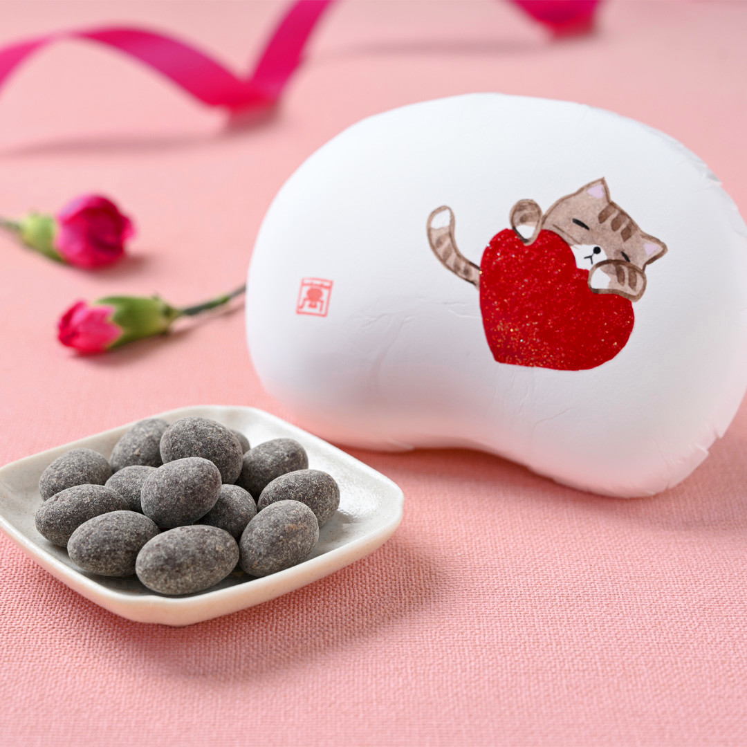 丹波の黒豆甘納豆を、ブレンドした2種類のチョコレートでコーティングしました。柔らかな食感、スイートなくちどけ、切れの良い酸味。色々な表情が詰まった豆菓子です。手描きで彩る豆箱は、バレンタインや猫の日の贈り物にぴったりな『ハートねこ』の絵柄でお届けいたします。