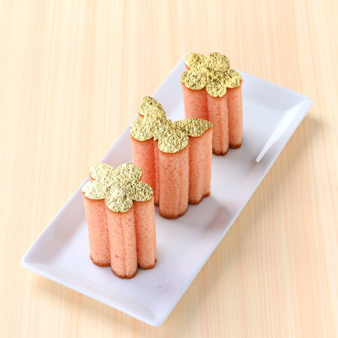 ふわりと香る桜風味のかすてら生地に、豪華絢爛な金箔を天面一枚貼り。桜や蝶の型抜きを楽しみながら、お召し上がりいただけます。美しい金箔にやさしく春らしい味わいで、気持ちが晴れやかになるような一品です。入卒や昇進、表彰などのお祝い事の贈り物や、春のご挨拶のお品にいかがでしょうか。