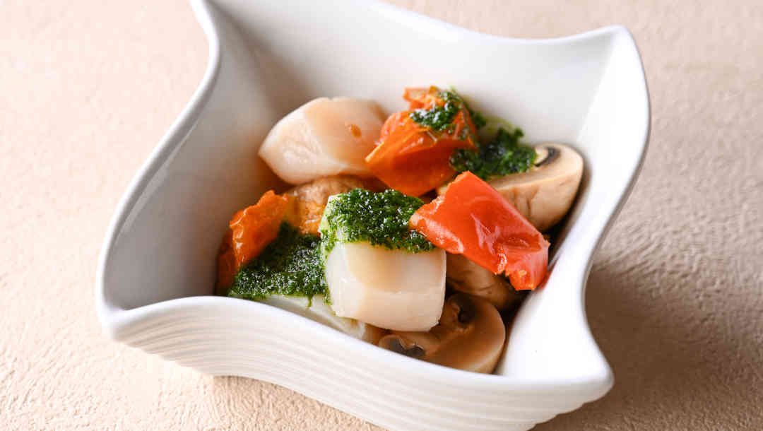 ガーリックオイルで和えた帆立とキノコに、パセリのきいたバターが溶けて絡まります。香り高いブルギニヨン風の味わいをお楽しみください。