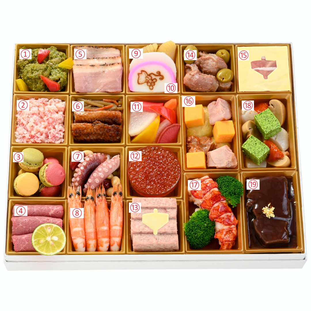 1. アンコウのフリット バジルソース 2. 紅ズワイガニのマヨネーズ和えとだし巻玉子 3. フォアグラクリーム マカロン 4. ローストビーフ 酢橘添え 5. 合鴨のパストラミと紫キャベツのマリネ 6. 鰻の甘辛焼き 根菜のアグロドルチェ 7. 蛸と色々な豆の煮込み 8. 有頭海老の白ワイン蒸し 9. 数の子の白ワイン漬け 10. 紅白かまぼこ 11. 彩り野菜のピクルス 12. サーモンリエット イクラ添え 13. 猪肉入りパテ・ド・カンパーニュ 14. スパイス香る砂肝のコンフィとオリーブのカクテル 15. 生ハムとオニオンのマリネ 16. 鶏もものスモーク、チェダーチーズ、ポテトのトリロジー 17. オマール海老のポシェ アメリケーヌソース 18. 帆立とキノコのブルギニヨンバター 19. 牛ホホ肉の赤ワイン煮とマッシュポテト