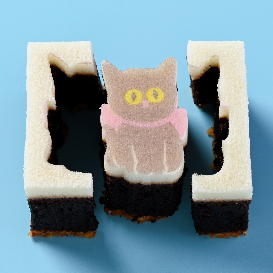 しっとり、濃厚な味わいに焼き上げたガトーショコラ。メレンゲを使ったいちばん上の真っ白生地に、ショコラの毛色の子猫の模様と切り抜きをほどこしました。そっと型抜きしながら、キャットもまわりのお菓子も美味しくめしあがれ。