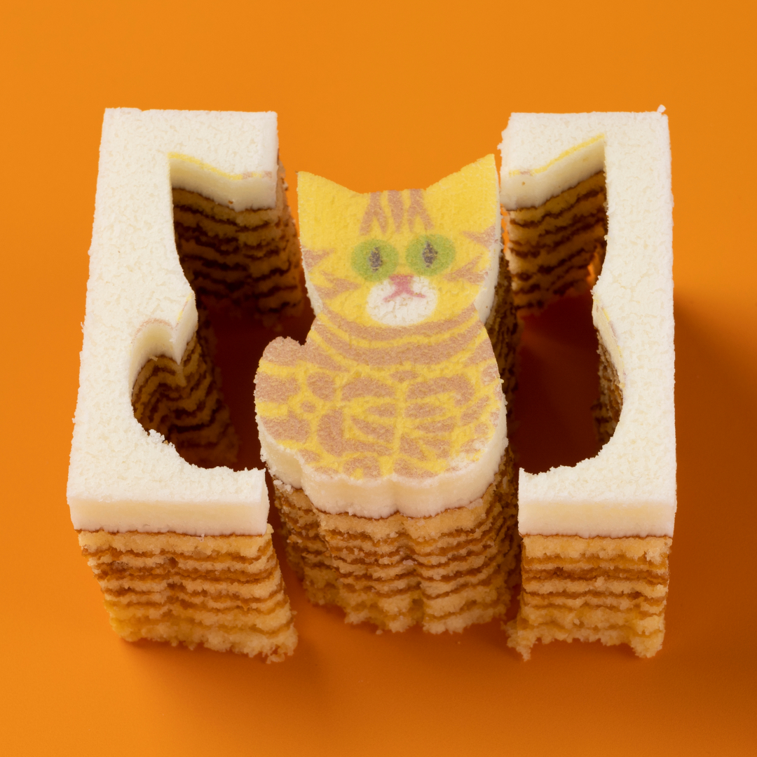 何層にも焼き重ねられたプレーン生地の平焼きバウムクーヘン。メレンゲを使ったいちばん上の真っ白生地に、アメリカ生まれのベンガルねこの模様と切り抜きをほどこしました。そっと型ぬきしながら、キャットもまわりのお菓子も美味しくめしあがれ。