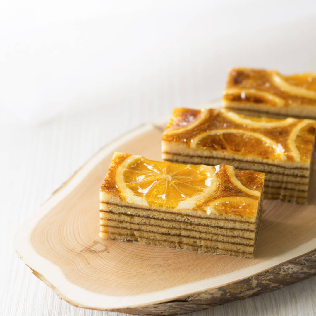 オープストバウムはドイツ語で「果樹」。年を重ねて焦げ茶色になった年輪は、砂糖を焦がして炊き上げたカラメル香るバウム生地。実る果実をオレンジで表現しました。森の動物たちが集まる果樹のように、しなやかで華やかな味わいをお楽しみください。