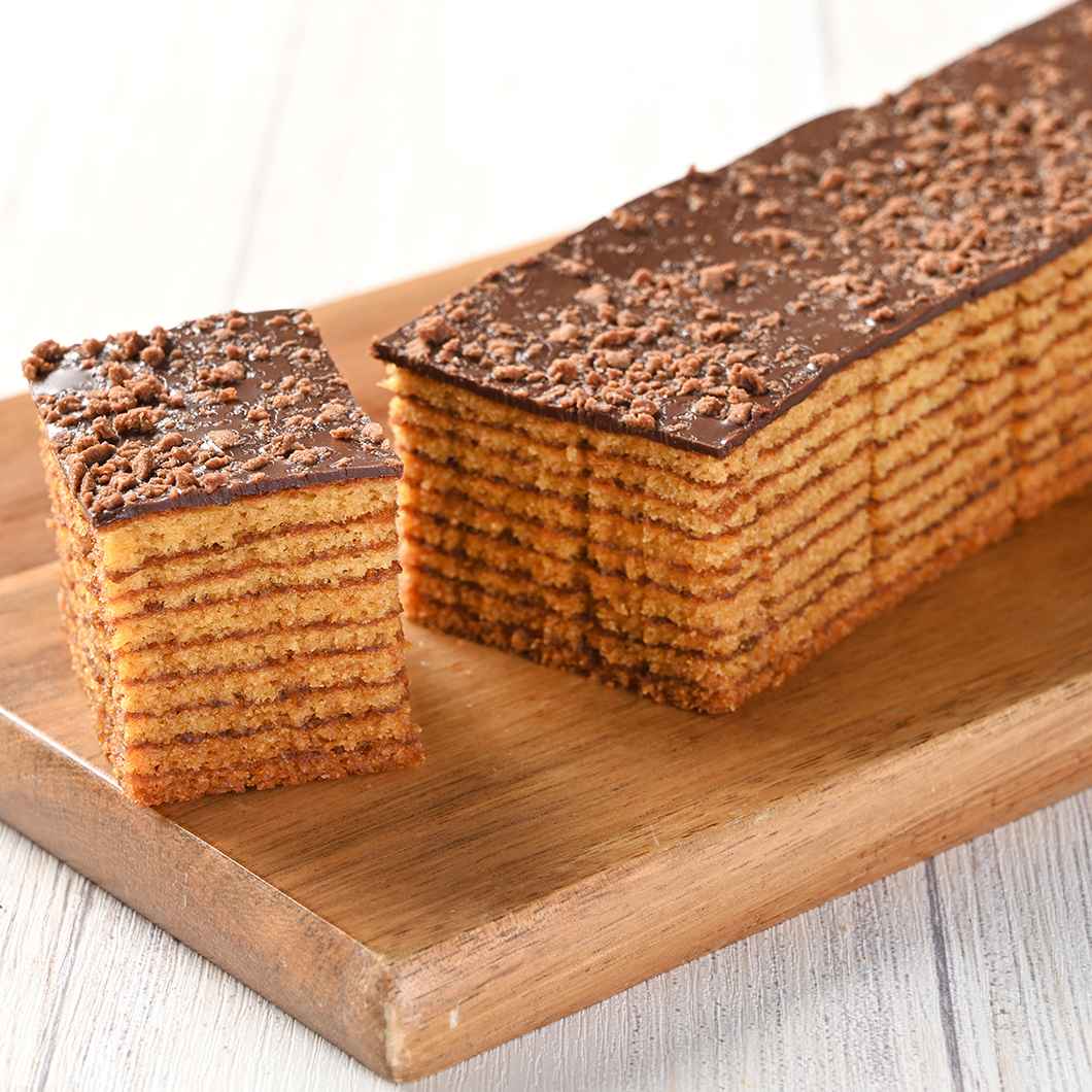 焦がしたカラメルのほのかなホロニガさ、コクのある甘さをしっとりと焼き上げた生地に閉じ込めました。コクをプラスするのは上掛けした口どけの良いチョコレート。ざくざくのクランチをたっぷりのせて、6カットにしました。