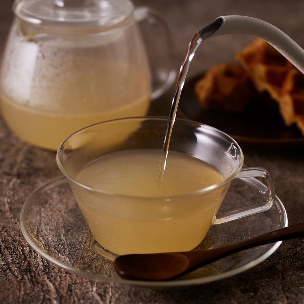 まずは炭酸で割って爽やかなジンジャーエールを。寒い時にはお湯で割って、身体がホッとするひとときをお楽しみください。焼酎で割るとホワイトサワーのベースにもなります。