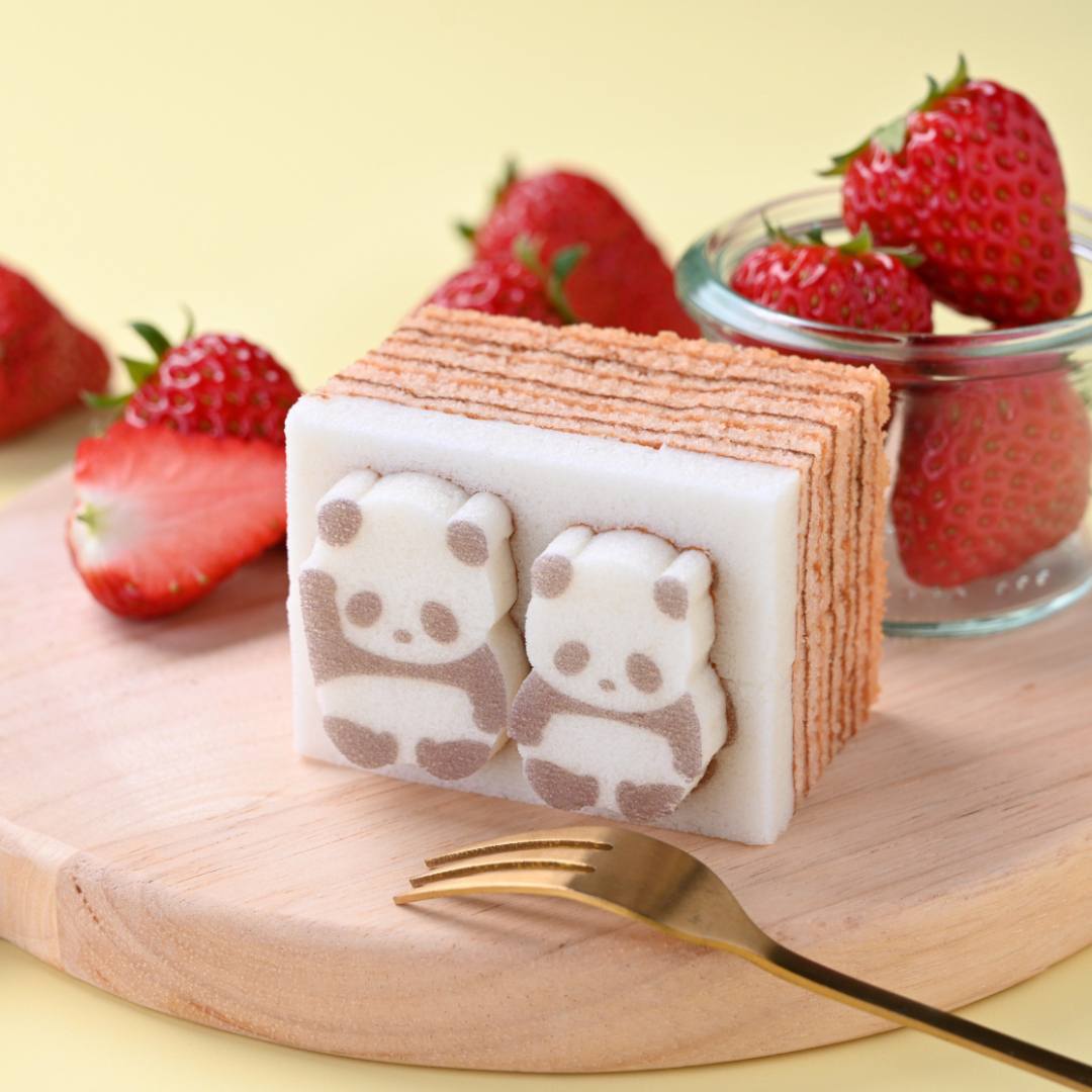 丁寧に焼きあげたいちご味のバウムに、ふんわり卵白仕立ての生地を重ねました。切込みに沿ってまわりの生地をはずすと、なかよしきょうだいパンダのシルエットがぽん、とあらわれます。