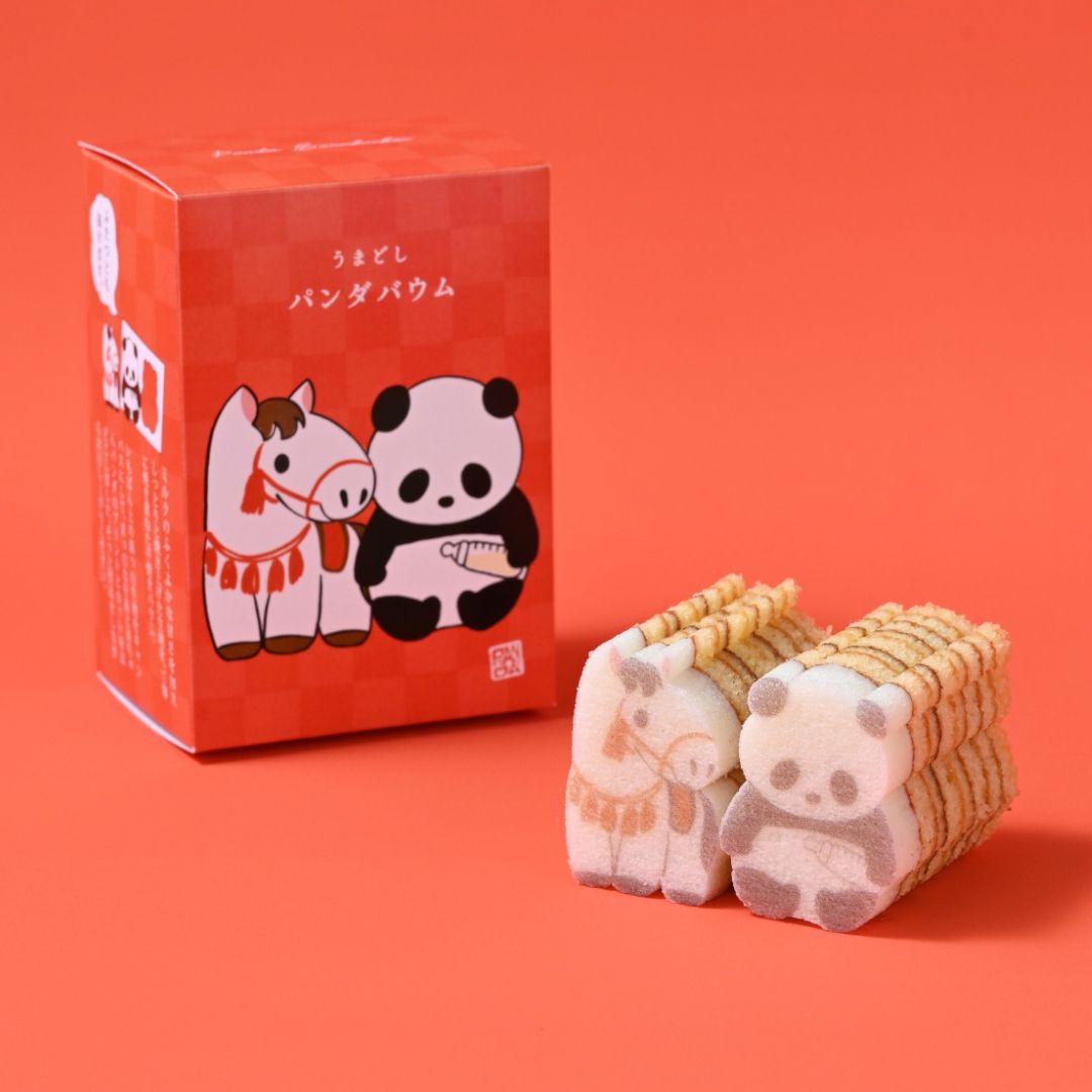 まだあどけない子馬と赤ちゃんパンダを型ぬきしながら楽しむ、ミルク味のバウムクーヘン。まろやかでコクのある、やさしいミルクの風味が広がります。