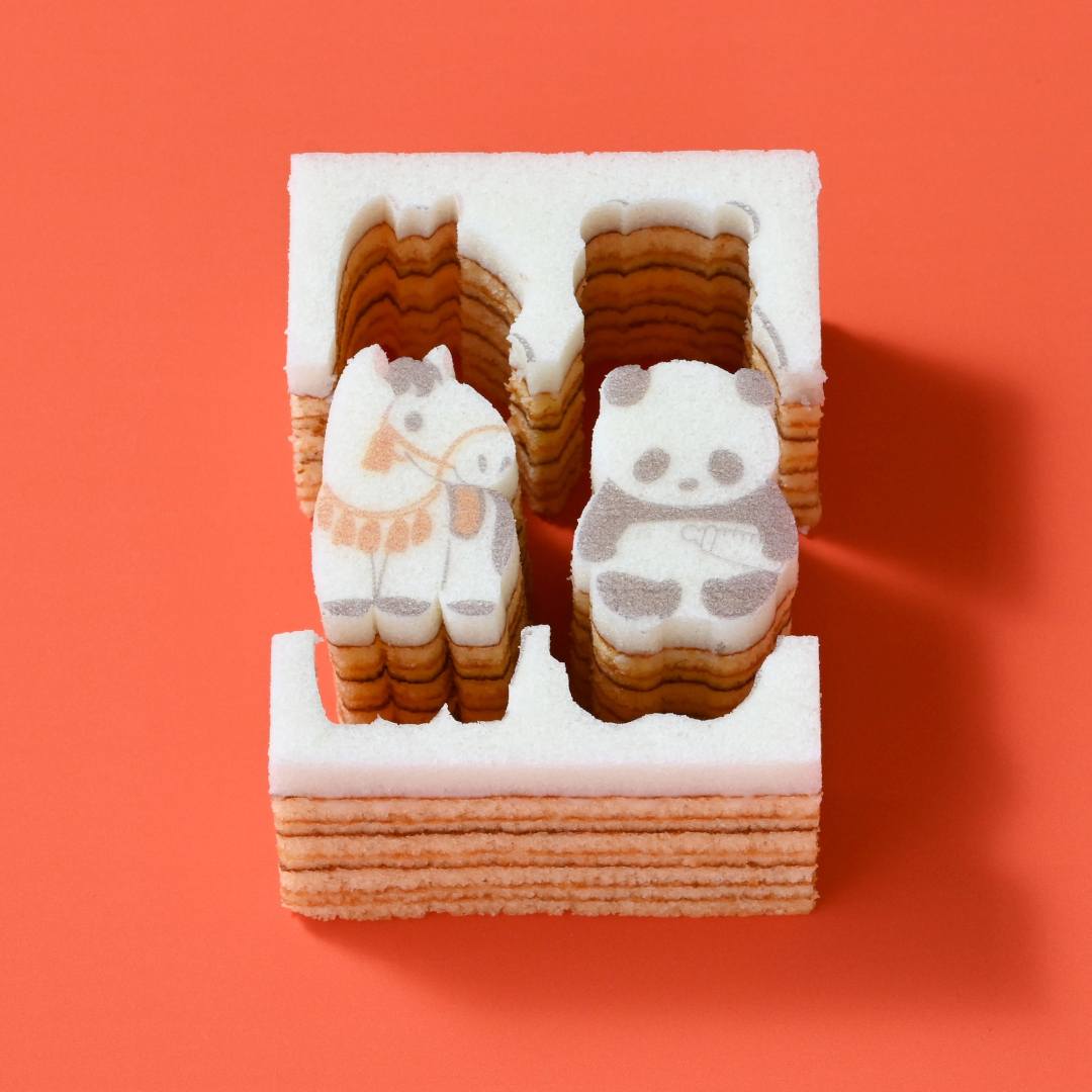 丁寧に焼きあげたミルク味のバウムに、ふんわり卵白仕立ての生地を重ねました。切込みに沿ってまわりの生地をはずすと、かわいい子馬と赤ちゃんパンダのシルエットがぽん、とあらわれます。