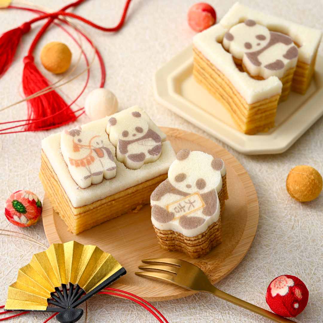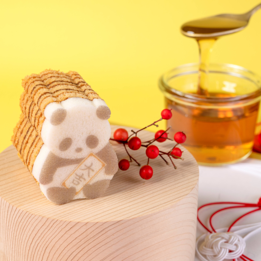丁寧に焼きあげたメープル味のバウムに、ふんわり卵白仕立ての生地を重ねました。切込みに沿ってまわりの生地をはずすと、おみくじを抱えたかわいいパンダのシルエットがぽん、とあらわれます。