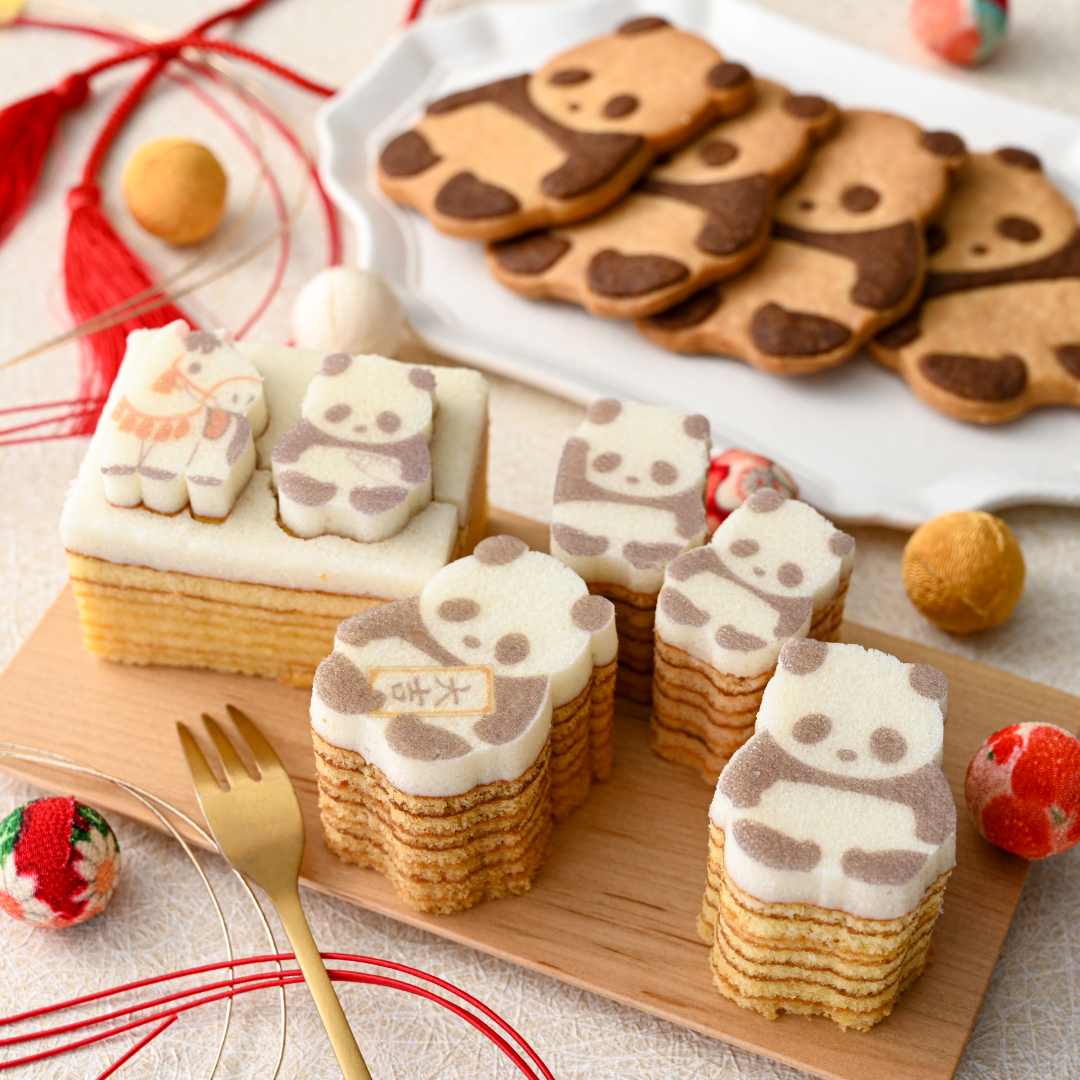 雪の降る季節に、そっと贈りたい小さな幸せ。お正月限定デザインを含む4種類のパンダバウムと、パンダサブレ4枚のセットです。