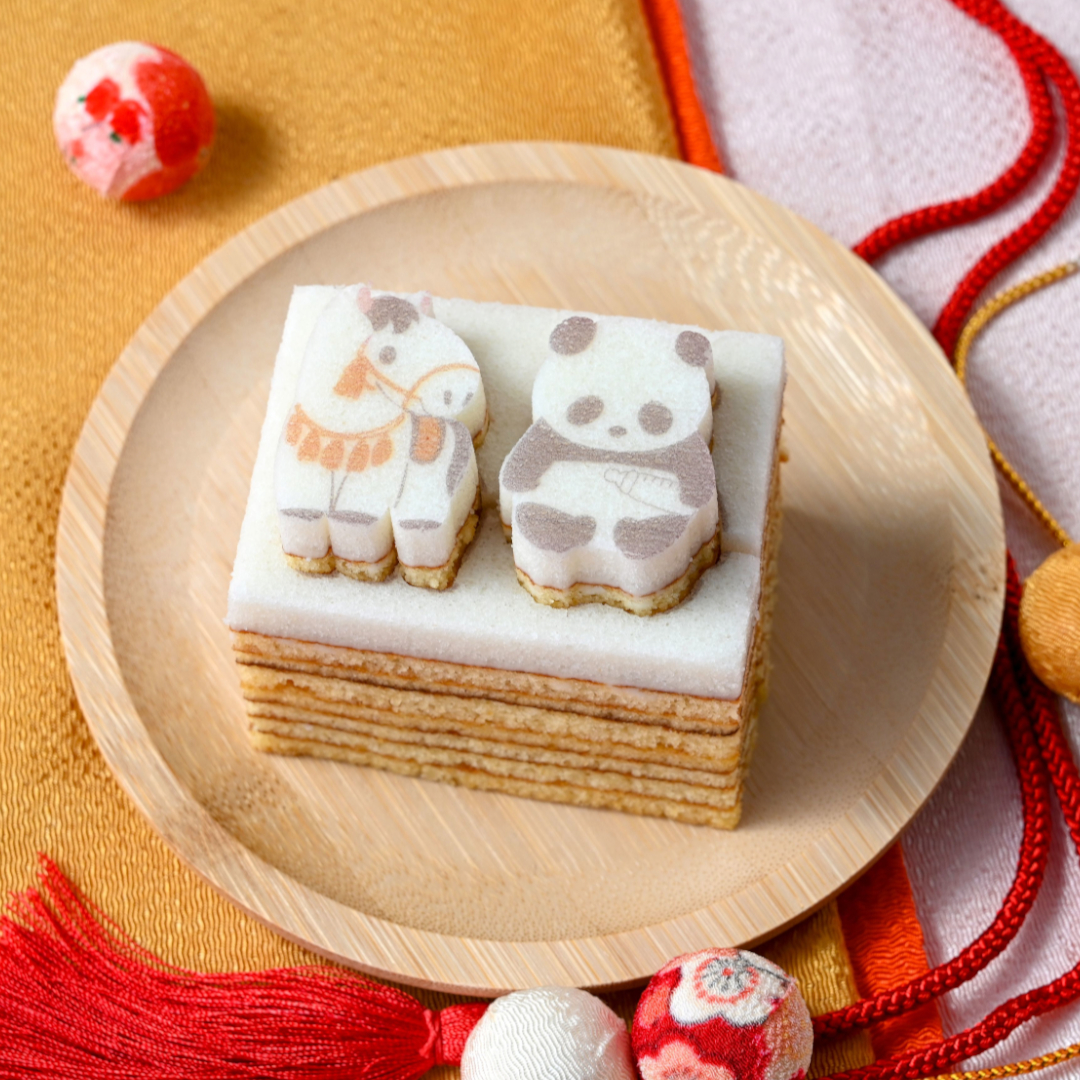 丁寧に焼きあげたメープル味のバウムに、ふんわり卵白仕立ての生地を重ねました。切込みに沿ってまわりの生地をはずすと、おみくじを抱えたかわいいパンダのシルエットがぽん、とあらわれます。