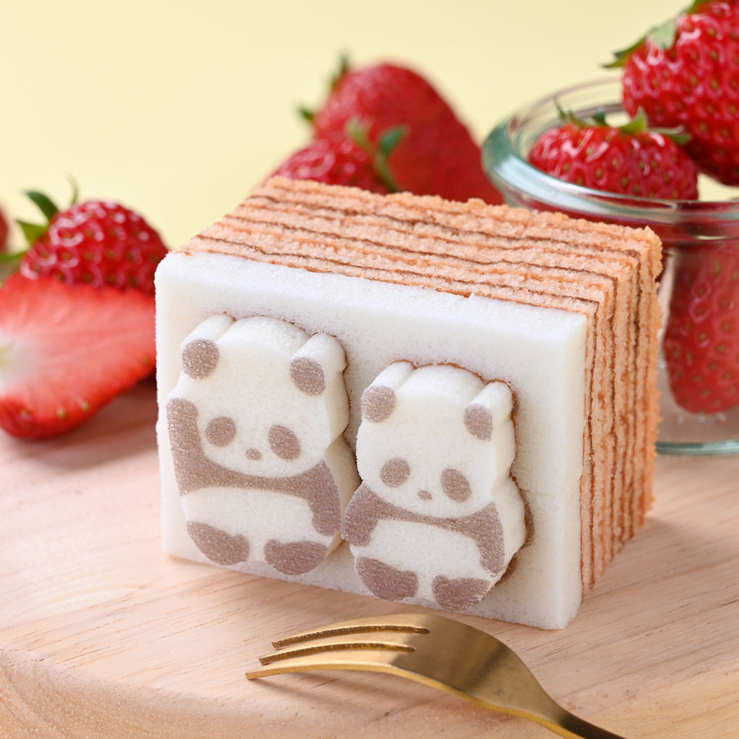 丁寧に焼きあげたいちご味のバウムに、ふんわり卵白仕立ての生地を重ねました。切込みに沿ってまわりの生地をはずすと、パンダきょうだいのシルエットがぽん、とあらわれます。