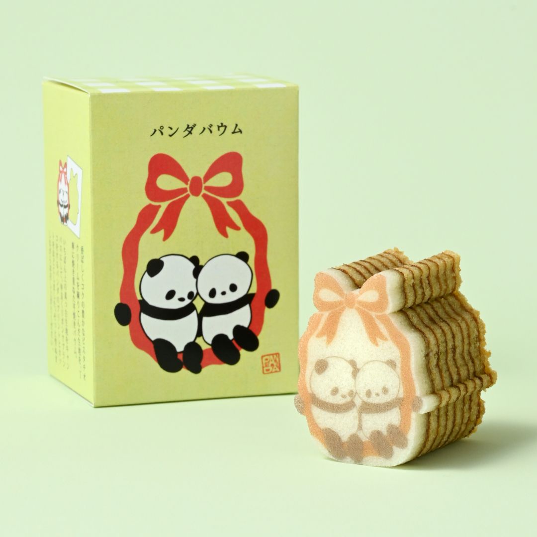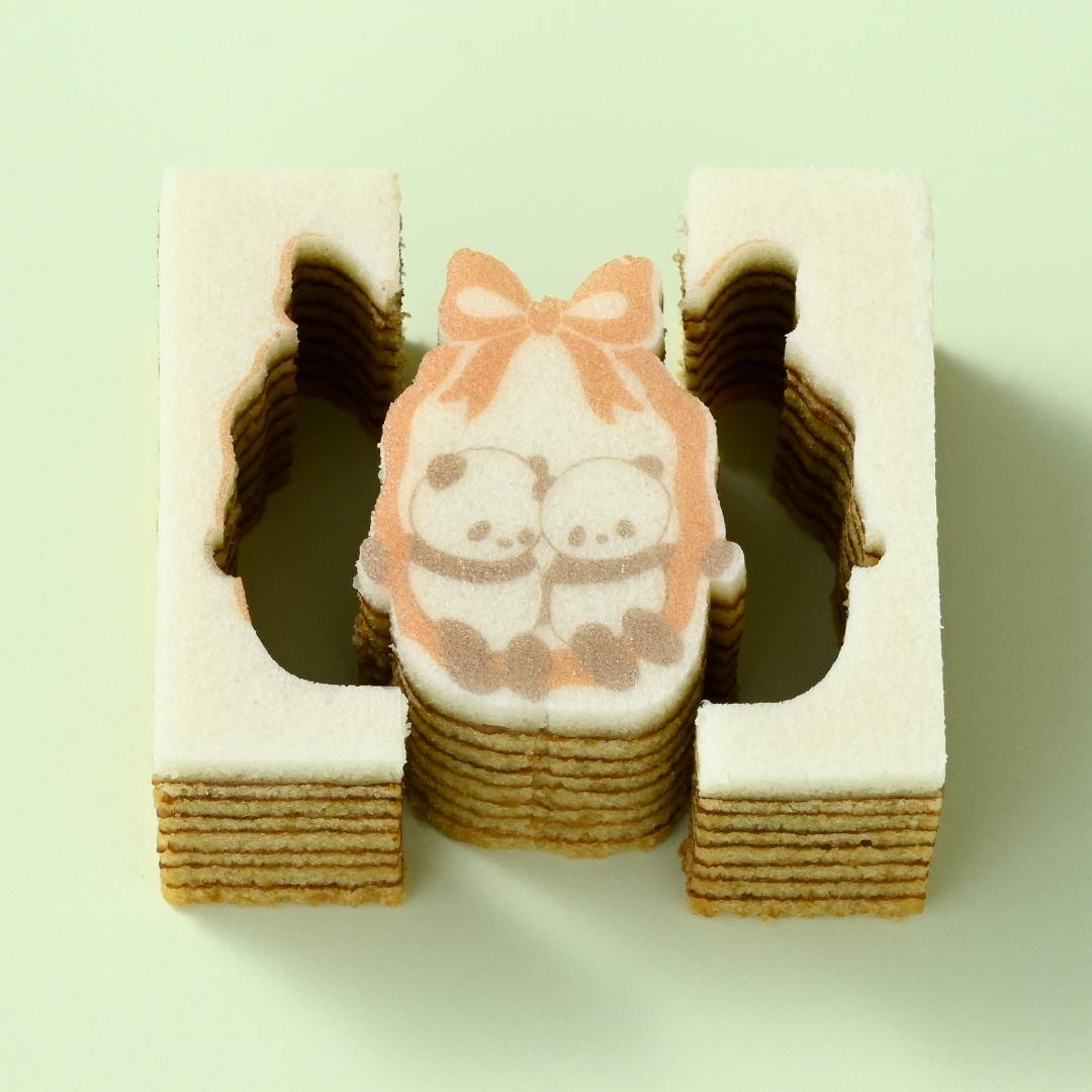 リボンのブランコにゆられるパンダを型ぬきしながら楽しむ、ピスタチオ味のバウムクーヘン。香ばしい風味とナッツのコクが広がります。