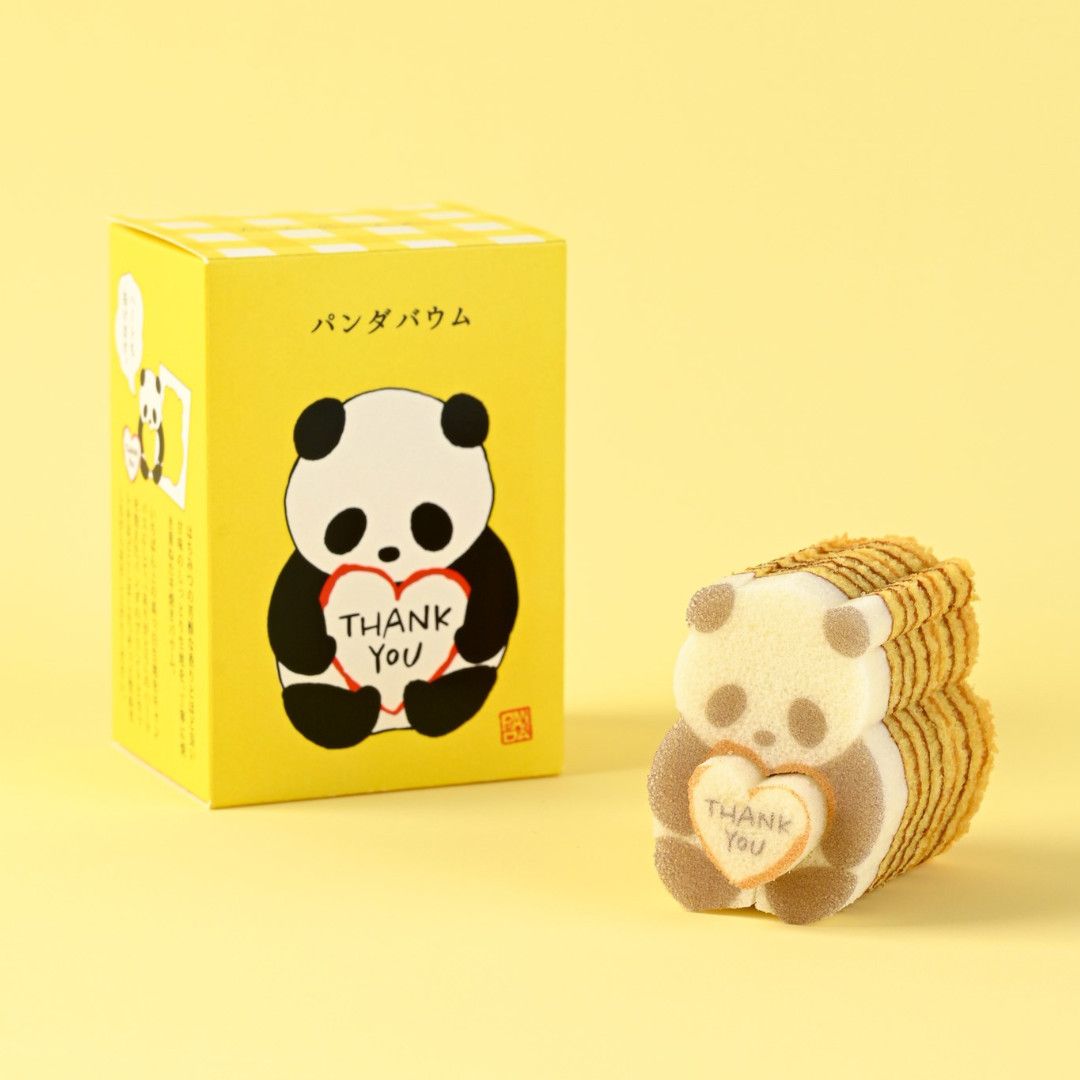 ハートをぎゅっと抱きしめたパンダを型ぬきしながら楽しむ、はちみつ味のバウムクーヘン。芳醇な香りとやさしい甘みが広がります。