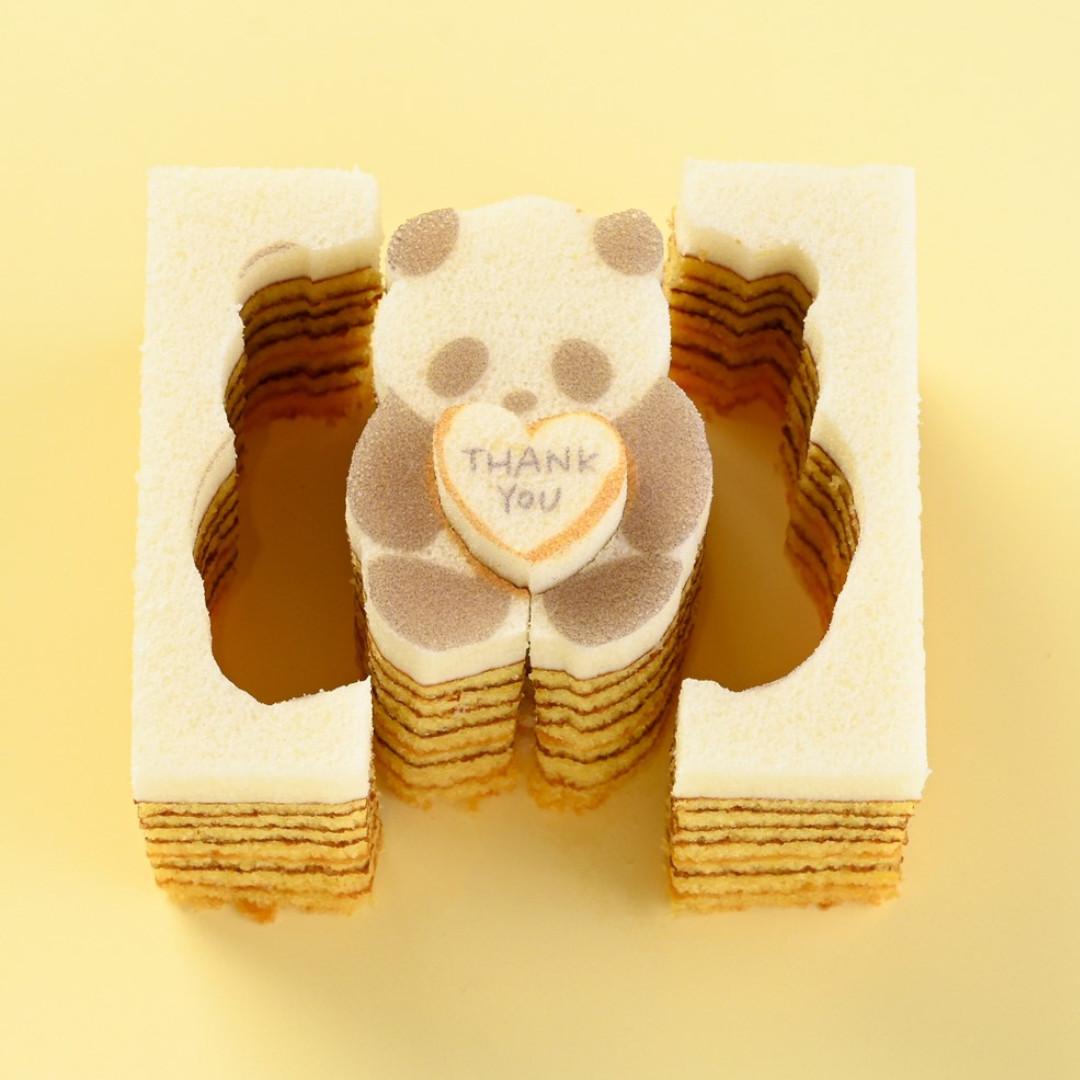 丁寧に焼きあげたはちみつ味のバウムに、ふんわり卵白仕立ての生地を重ねました。切込みに沿ってまわりの生地をはずすと、かわいいパンダのシルエットがぽん、とあらわれます。