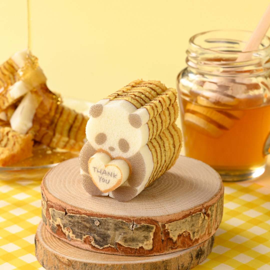 「ありがとう」の気持ちを贈るパンダバウムができました。パンダが抱えている、ハートの部分も型ぬきできます。芳醇な香りとやさしい甘みが広がるはちみつ味。