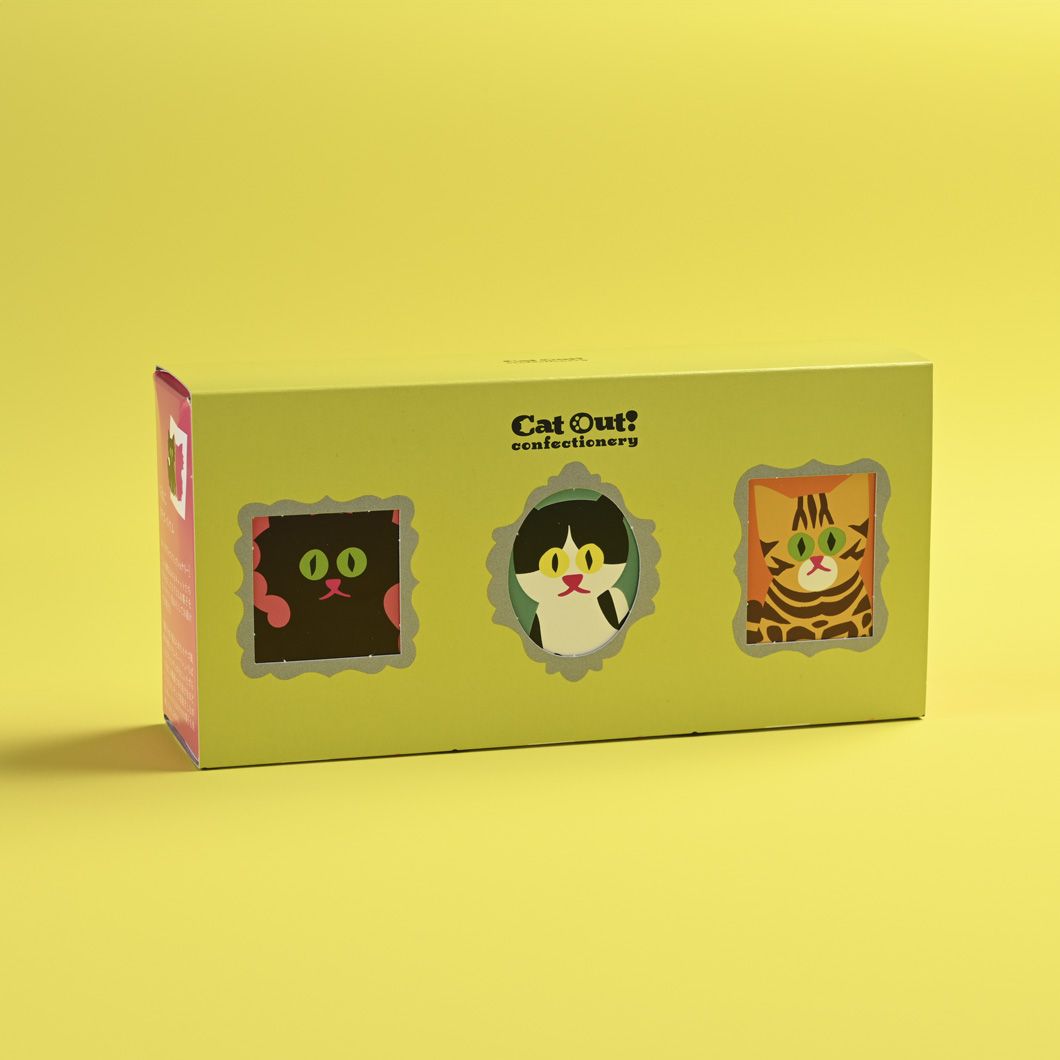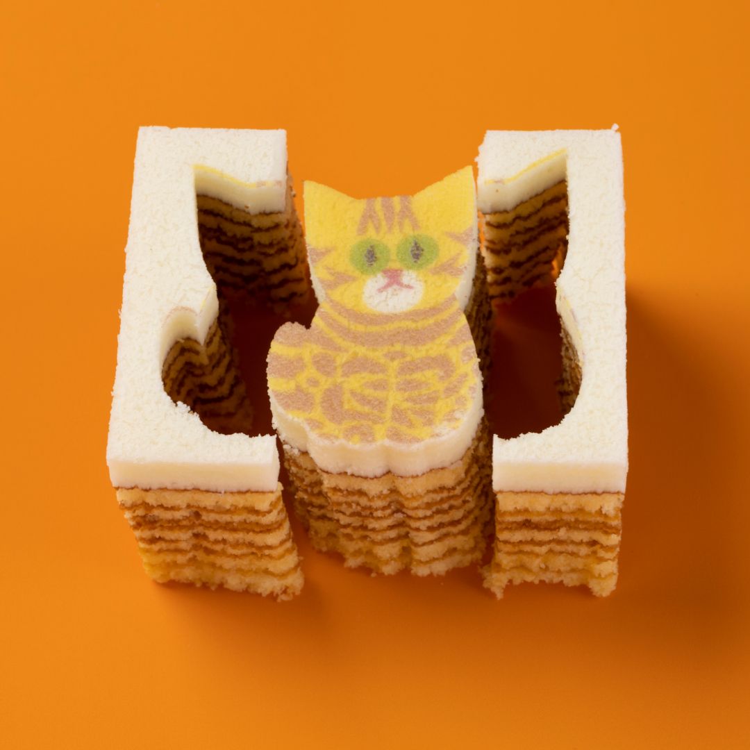 りっぱな八割れ模様と、とぼけた顔がチャーミングなぶちねこです。バウムの生地は、何層にも焼き重ねられた塩キャラメル風味の平焼きバウムクーヘン。メレンゲを使ったいちばん上の真っ白生地に、とぼけたぶちねこの模様と切り抜きをほどこしました。そっと型ぬきしながら、キャットもまわりのお菓子も美味しくめしあがれ。