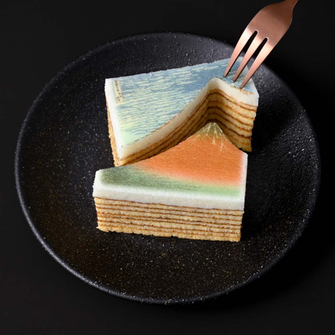 『冨嶽三十六景』の一図《凱風快晴》をモチーフにした型抜きバウム。菓子に映えるよう、色彩や構図を再構成し、繊細な色の階調までもをお菓子に表現しました。