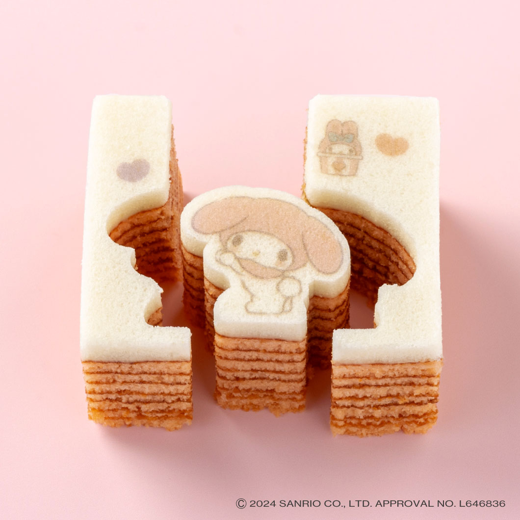 一枚ごとに、じっくり丁寧に焼き上げたいちご味の平焼きバウムを、マイメロディのかたちにカット。そっと取りだして、一口ずつ味わってみてください。ひとりでも、みんなでも、おいしくたのしいバウムです。
