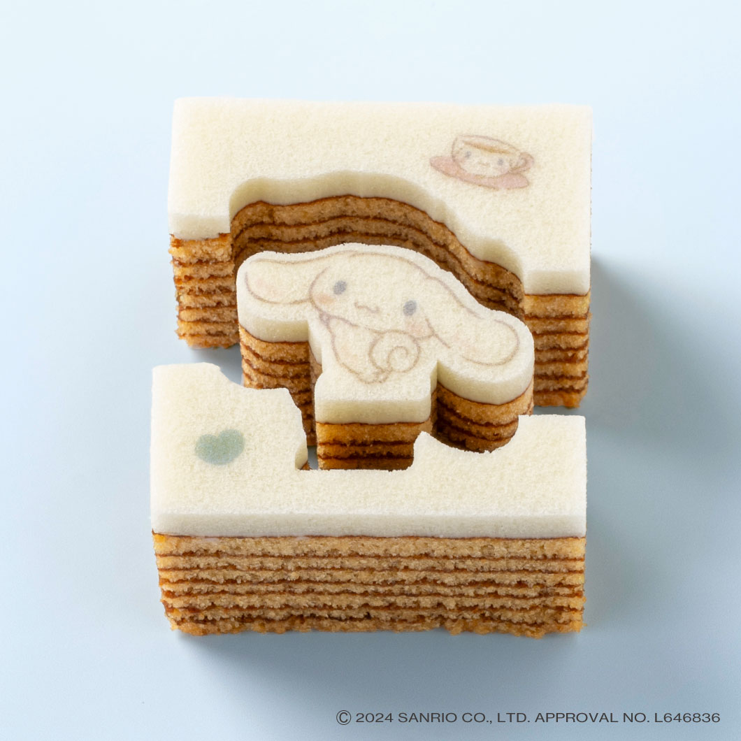 一枚ごとに、じっくり丁寧に焼き上げたメープル味の平焼きバウムを、シナモロールのかたちにカット。そっと取りだして、一口ずつ味わってみてください。ひとりでも、みんなでも、おいしくたのしいバウムです。