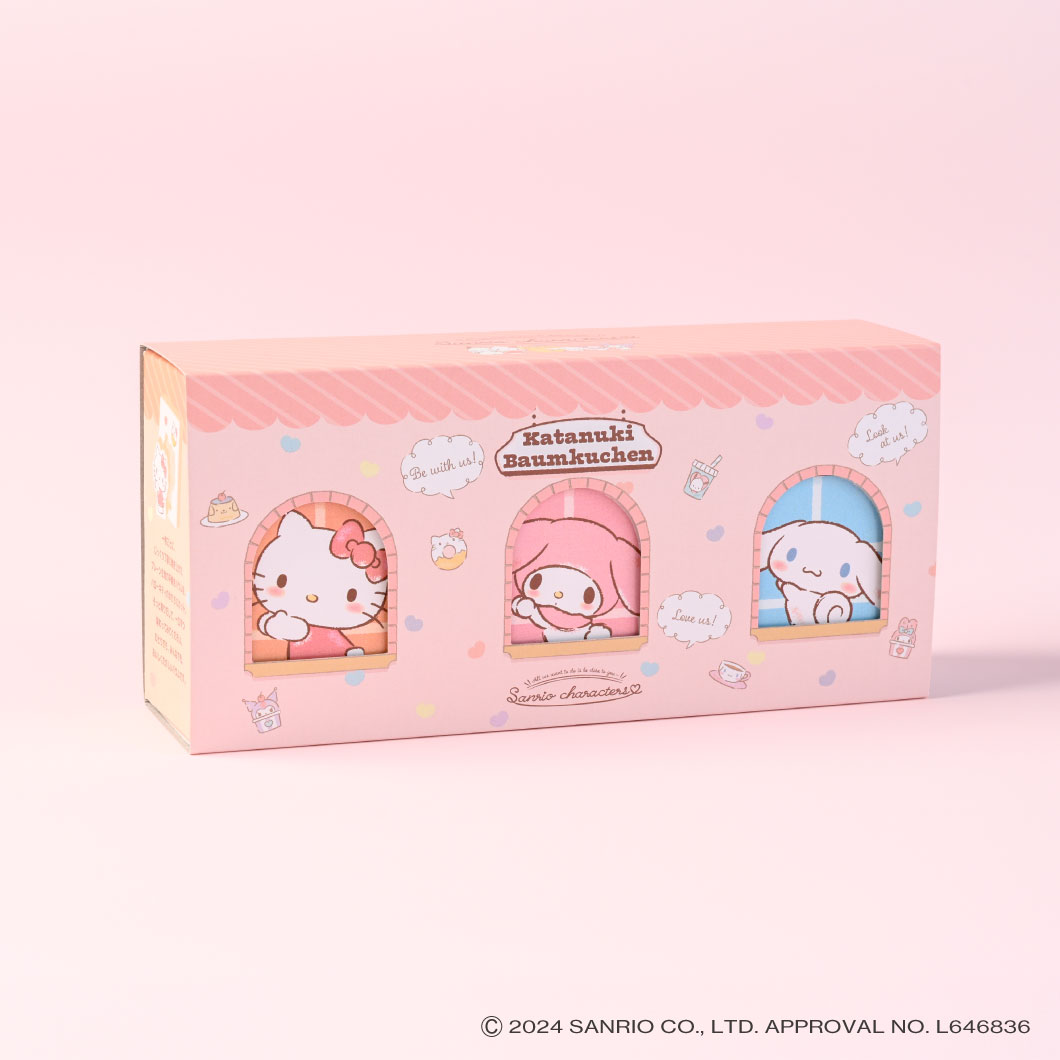 カタヌキヤ自慢の平焼きバウムクーヘンに、「ねーねーかまって♡」とかわいく甘えるサンリオキャラクターズをプリントしました。そっと型ぬきして並べると、つながるすがたに思わずきゅん♡ハローキティ、マイメロディ、シナモロールが窓からかわいくのぞく、キュートなパッケージにつめてお届けします。