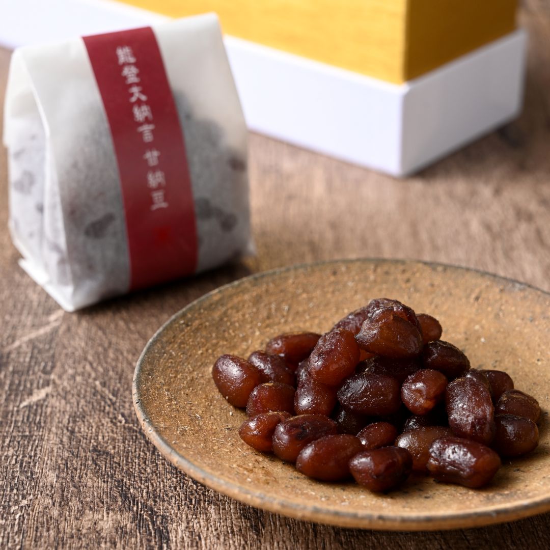 石川県能登の珠洲市で作られる黒豆。能登の大地に育まれた黒豆を丁寧に甘く煮てお作りした甘納豆は、惚れ惚れするほど艶やかでほくほくとした食感が自慢の一品です。