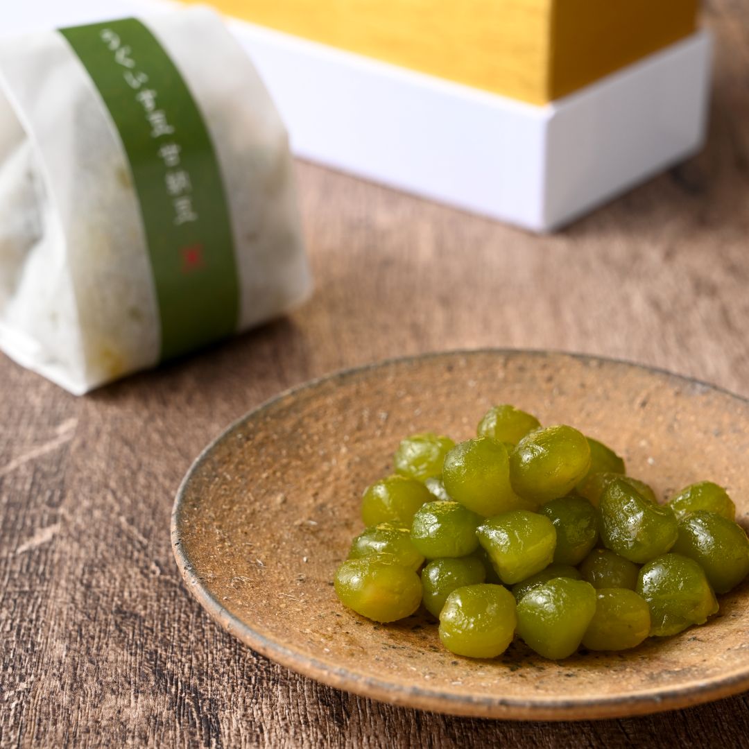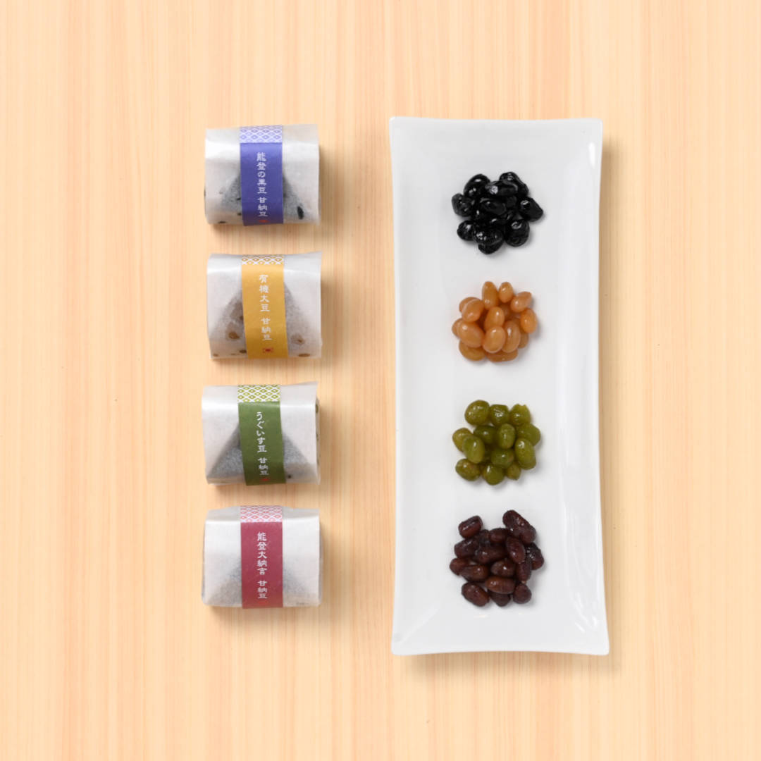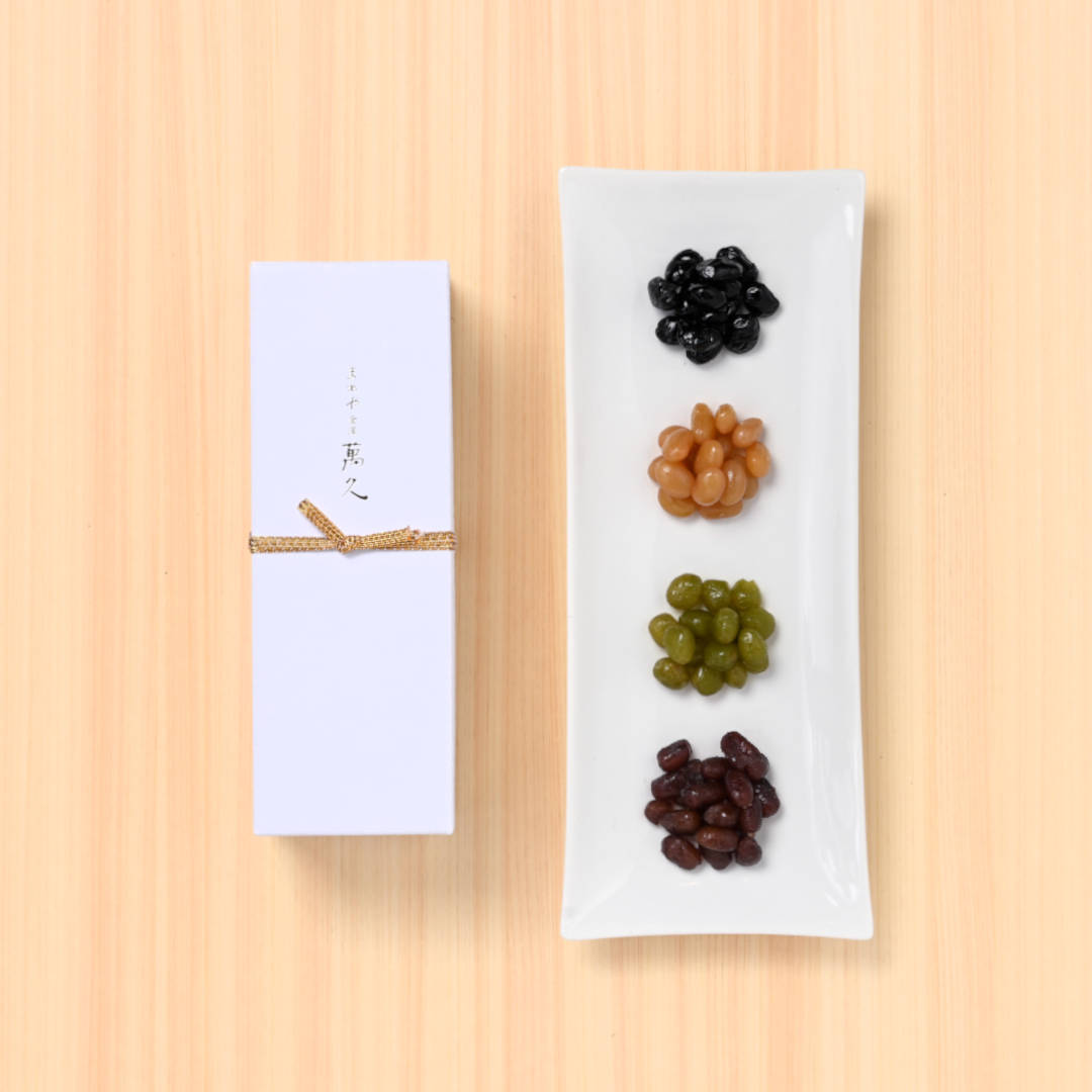 萬久でも人気の能登大納言と能登の黒豆甘納豆、有機大豆の甘納豆に加え、彩も鮮やかなうぐいす豆をプラスした限定セットです。ぜひ、見て美しさを、食べて美味しさをお楽しみください。