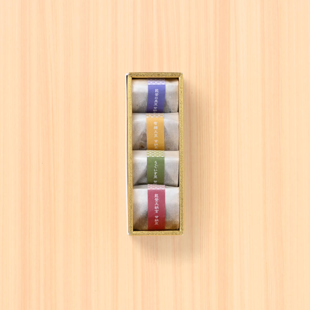 甘納豆4種セット、甘美彩菓(かんびさいか)です。どれも上品な甘さと柔らかさで、年齢を問わずにお召し上がりいただけます。豪華な見た目も然ることながら、ずっしりとした重量感は贈られた方にもきっとご満足いただける一品です。御礼・内祝いのお品などにいかがでしょうか。