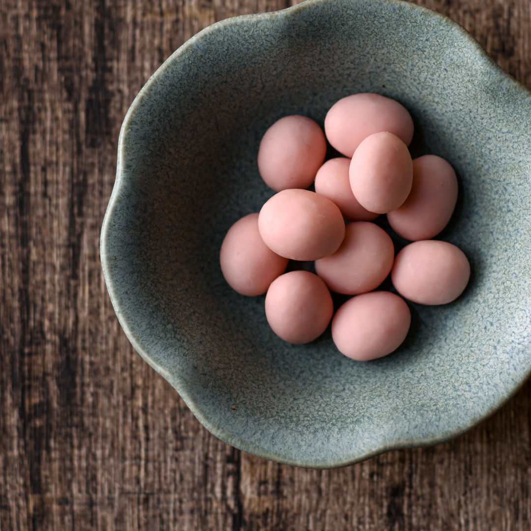 苺チョコレートに合わせた炒り豆は、能登塩を使ったしおみつ風味で苺の甘さが引き立つように。口に広がるいちごの香りは、お子さまから大人まで幅広い層に人気です。