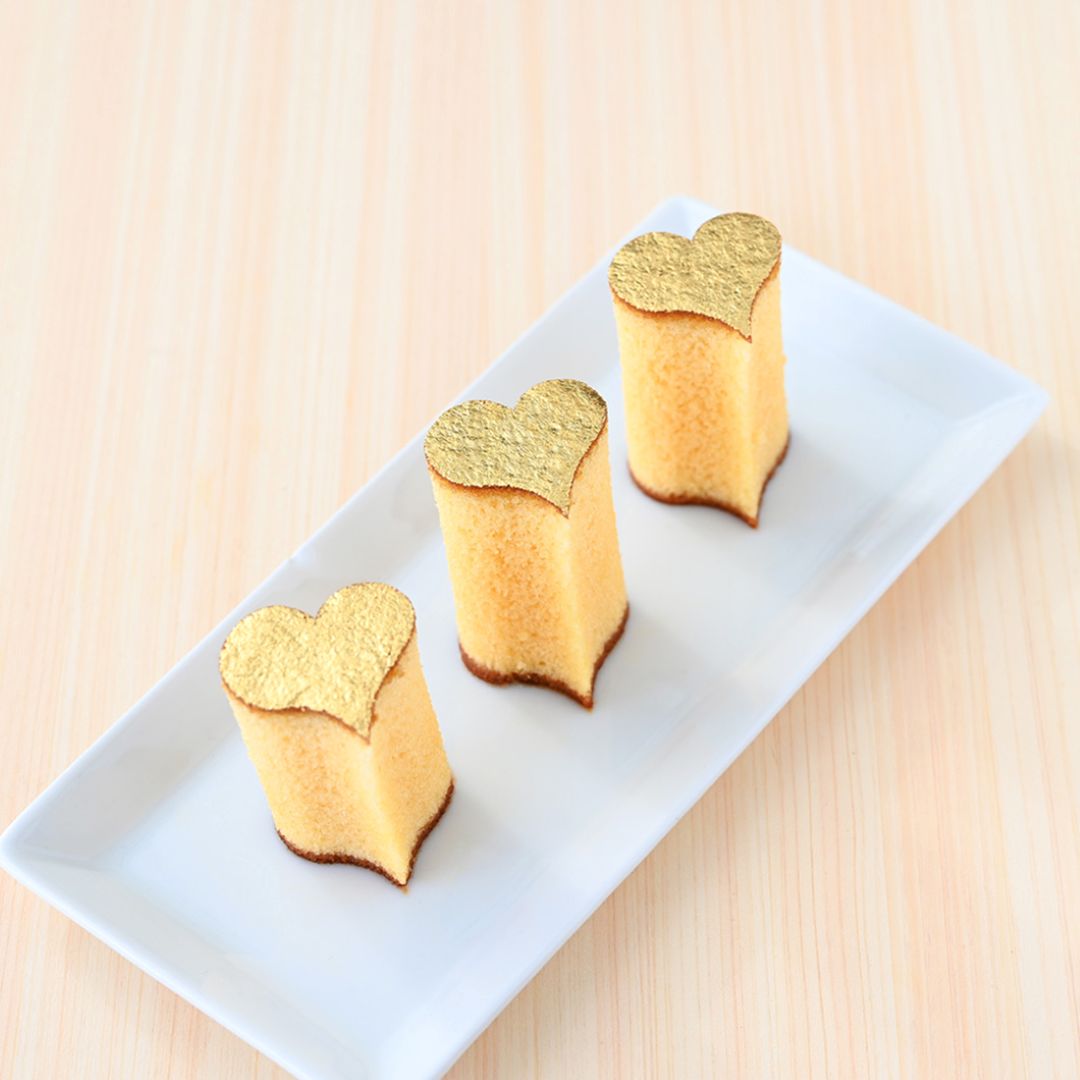 金箔輝くかすてらにハートのカットを3つ施しました。カットのまわりのカステラを丁寧にとってお召し上がりいただくと、中からハートが出てきます。